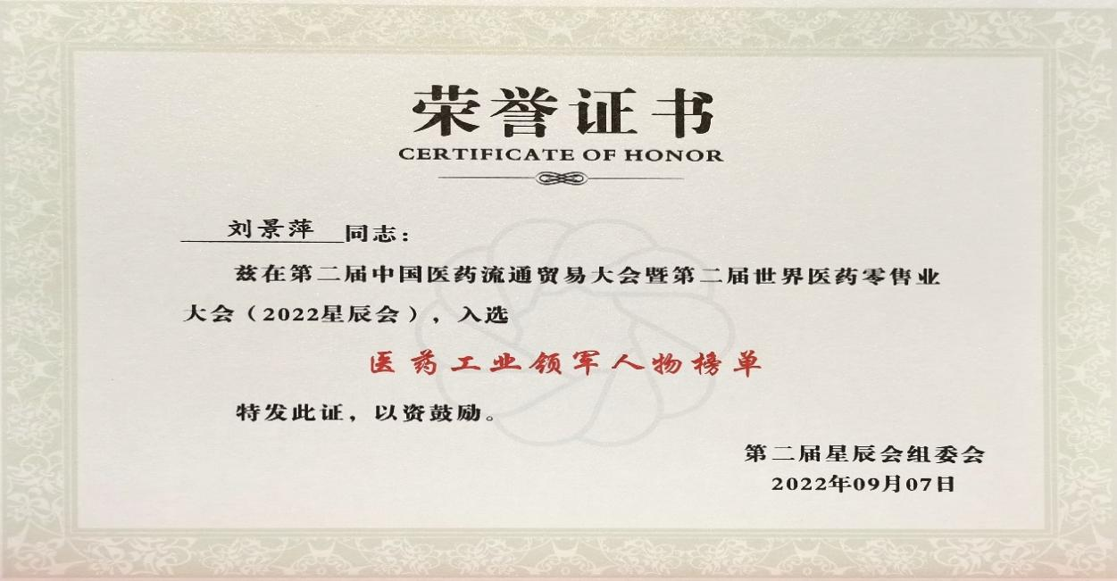 在本次开幕式上,发布了“医药工业领军人物”、“医药零售领军人物”榜单,尊龙官方网站药业集团刘景萍董事长凭借在儿药领域多年的努力探索和对行业的杰出贡献,荣获“医药工业领军人物”称号。